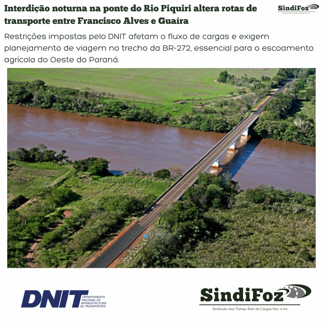 Interdição noturna na ponte do Rio Piquiri altera rotas de transporte entre Francisco Alves e Guaíra.