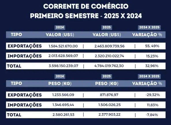 A corrente de comércio fronteiriço cresceu 32,96% em relação ao mesmo período de 2024, estabelecendo um novo recorde. Embora a quantidade física tenha caído 7,84% — de 2,58 milhões para 2,37 milhões de toneladas — o valor agregado das mercadorias foi significativamente maior, demonstrando mudança no perfil das cargas movimentadas.