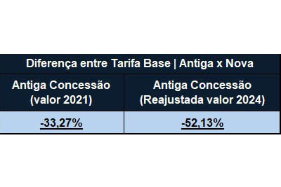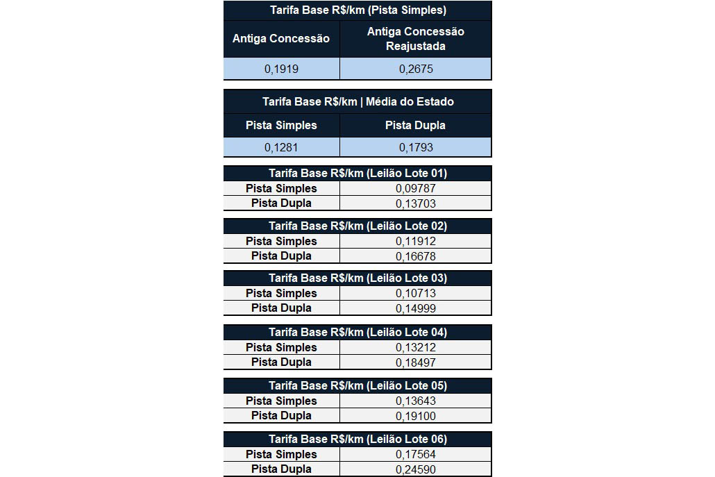 Com o último leilão, realizado na quinta-feira (30), a tarifa média por quilômetro rodado caiu significativamente em relação aos contratos encerrados em 2021. Caso os valores anteriores fossem corrigidos pela inflação, o desconto acumulado chegaria a 52,13%. Até 2021, a tarifa base média era de R$ 0,1919 em pistas simples e R$ 0,2675 em rodovias duplicadas. Com as novas concessões, os valores passam a ser R$ 0,1281 e R$ 0,1793, respectivamente.
