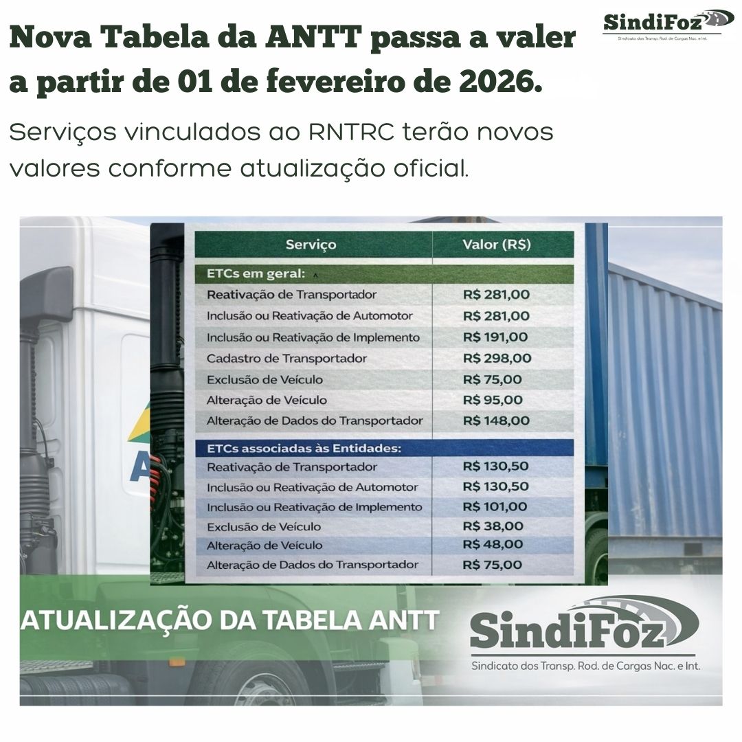 O SindiFoz – Sindicato das Empresas de Transporte Rodoviário de Cargas de Foz do Iguaçu e Região informa aos seus associados que a ANTT publicou a nova Tabela de Valores dos Serviços vinculados ao RNTRC, com vigência a partir de 01 de fevereiro de 2026.
